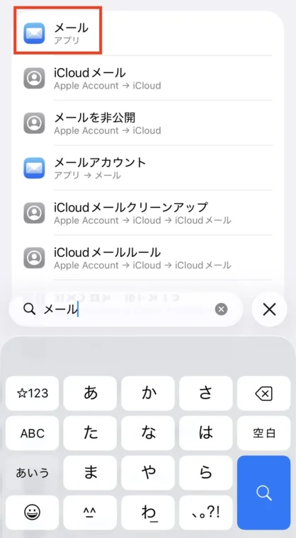 一番下の方に検索ボックスがあるので、そこに「メール」と入力します。