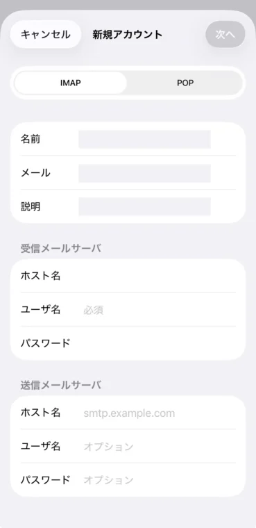 一番上でIMAPかPOPかが選べるようになっていますが、おすすめはIMAPです。
