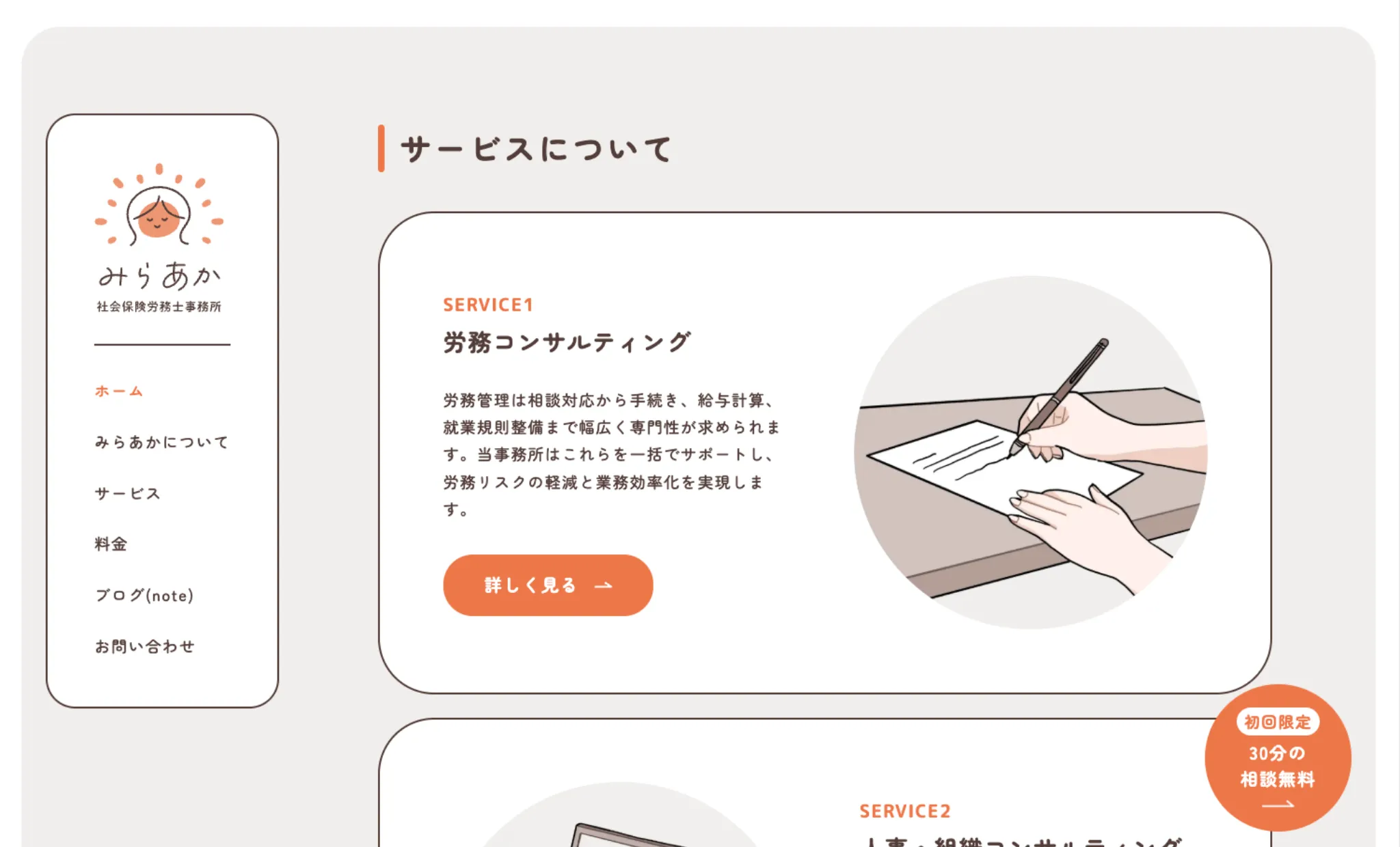 「堅いイメージを持たれがちな社労士の世界を、もっと身近で相談しやすくしたい」というクライアント様の想いをもとに、やさしい色合いと丸みのあるデザインで「女性社労士ならではの安心感」と「親しみやすさ」を表現しました。